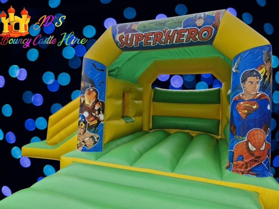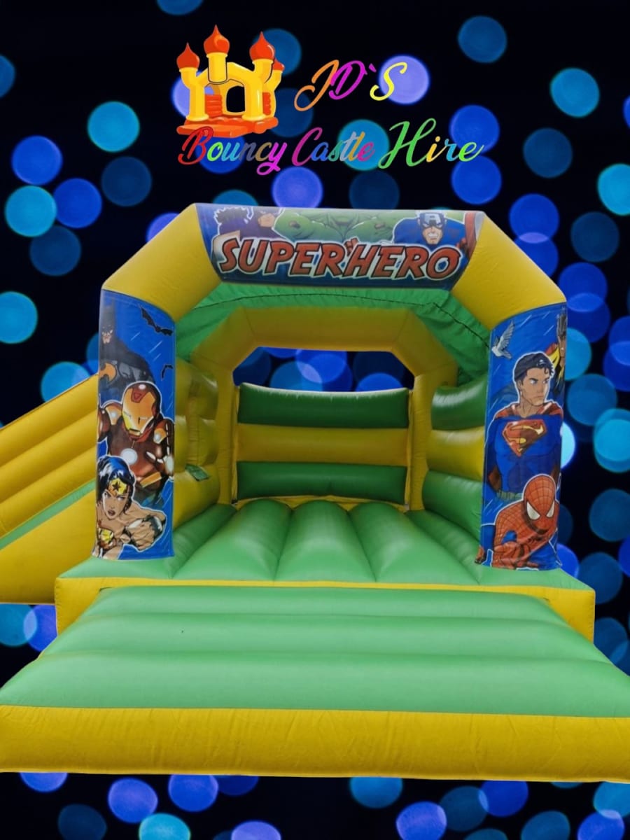 Transform your child's special day into an unforgettable adventure with our Superhero Combi Castle. Perfectly designed for Birthday Parties and Special Occasions, this vibrant bouncy castle brings the thrill of superhero action to any event. Featuring eye-catching heroic artwork in lively green and yellow colours, it sets the stage for a day full of excitement and laughter. đڏâď¸đ